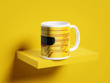 Lewis Hamilton Ferrari 2025 F1 helmet mug resting on a bed of ground coffee, showcasing the bold yellow design with red accents.